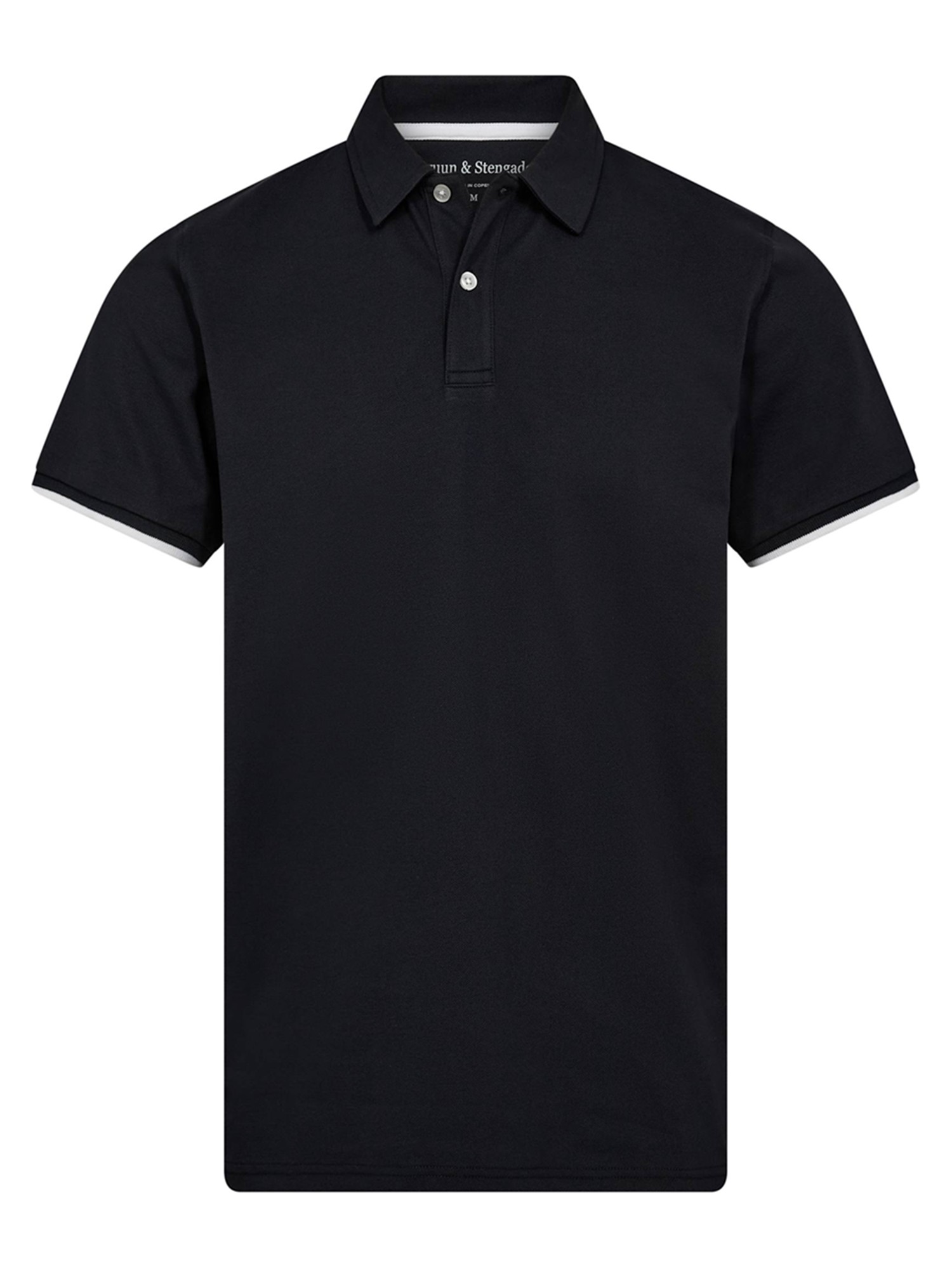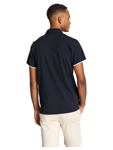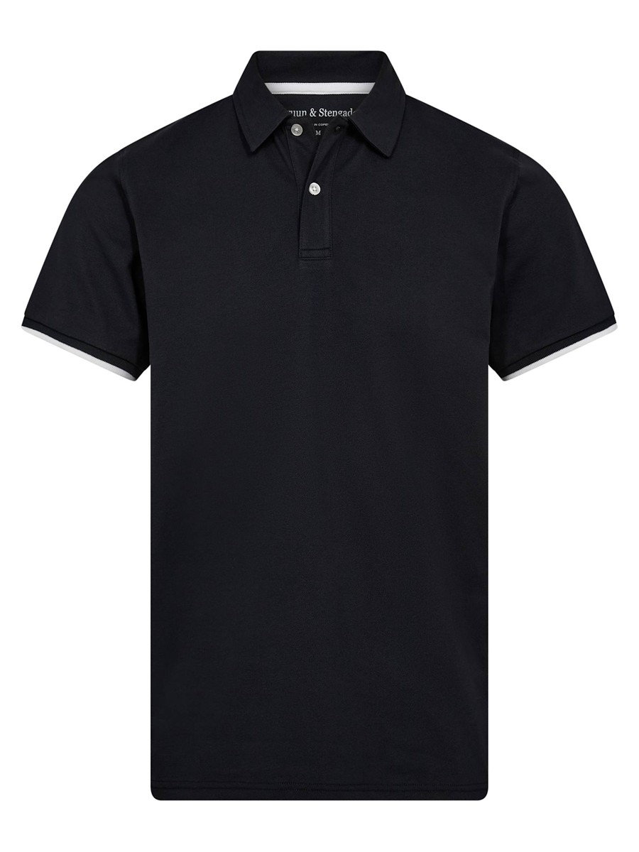 Klassisk piquépolo i bomuld med stretch. Normal krave med indvendig kontrastkant, stolpelukning med perleknapper til lukning og kontrastfarvedetaljer på begge ærmekanter.