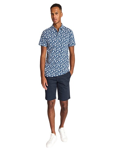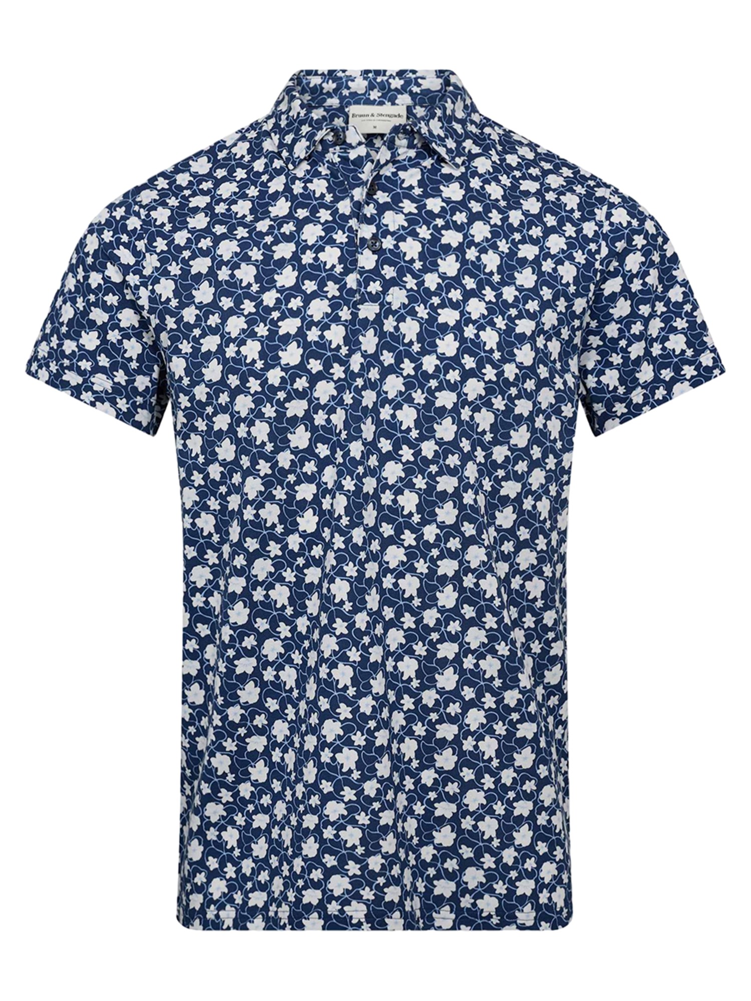 Klassisk almindelig piquépolo med tryk i bomuld med elastan for komfort. Normal krave og stolpelukning med perleknapper.