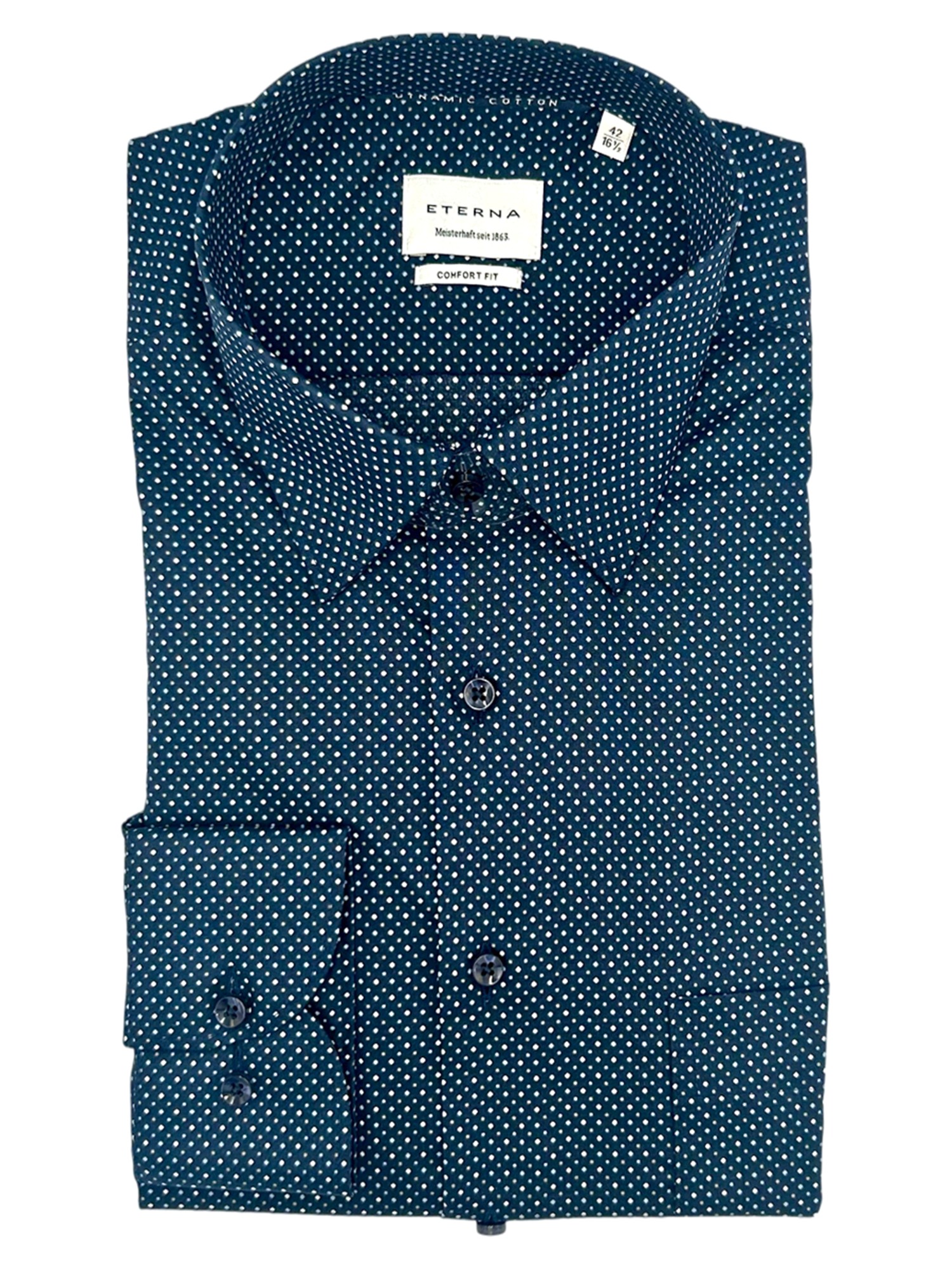 Eterna har siden de blev grundlagt i 1863 været kendt for deres gode kvalitet og ikke mindst deres ekceptionelle kvalitet. Eterna anvender bomuld og certificerede garner i deres skjorter og er derfor strygefrie. Alle Eternas skjorter er certificeret og produceret under de højeste Oeko-Tex standarder i Europa. Det betyder at samtlige skjorter er testet fri for en lang række giftige og miljøskadelige kemikalier. Eterna producerer deres skjorter i forskellige pasformer; Super Slim Fit, Slim Fit, Modern Fit og Comfort Fit - hertil fåes nogle skjorter med variende armlængde. Hos Bygholm Menswear har vi et bredt udvalg af Eterna til de allerbedste priser.