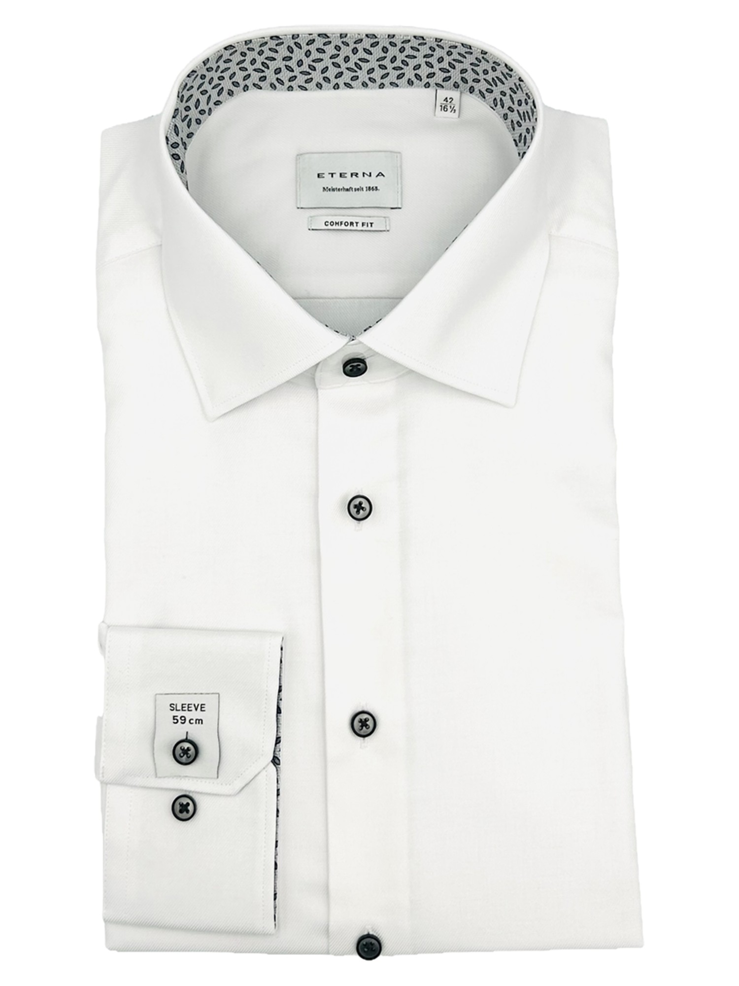 Eterna har siden de blev grundlagt i 1863 været kendt for deres gode kvalitet og ikke mindst deres ekceptionelle kvalitet. Eterna anvender bomuld og certificerede garner i deres skjorter og er derfor strygefrie. Alle Eternas skjorter er certificeret og produceret under de højeste Oeko-Tex standarder i Europa. Det betyder at samtlige skjorter er testet fri for en lang række giftige og miljøskadelige kemikalier. Eterna producerer deres skjorter i forskellige pasformer; Super Slim Fit, Slim Fit, Modern Fit og Comfort Fit - hertil fåes nogle skjorter med variende armlængde. Hos Bygholm Menswear har vi et bredt udvalg af Eterna til de allerbedste priser.