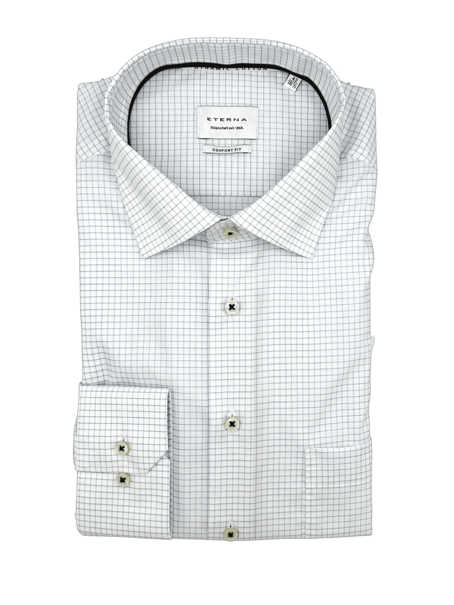 Eterna har siden de blev grundlagt i 1863 været kendt for deres gode kvalitet og ikke mindst deres ekceptionelle kvalitet. Eterna anvender bomuld og certificerede garner i deres skjorter og er derfor strygefrie. Alle Eternas skjorter er certificeret og produceret under de højeste Oeko-Tex standarder i Europa. Det betyder at samtlige skjorter er testet fri for en lang række giftige og miljøskadelige kemikalier. Eterna producerer deres skjorter i forskellige pasformer; Super Slim Fit, Slim Fit, Modern Fit og Comfort Fit - hertil fåes nogle skjorter med variende armlængde. Hos Bygholm Menswear har vi et bredt udvalg af Eterna til de allerbedste priser.