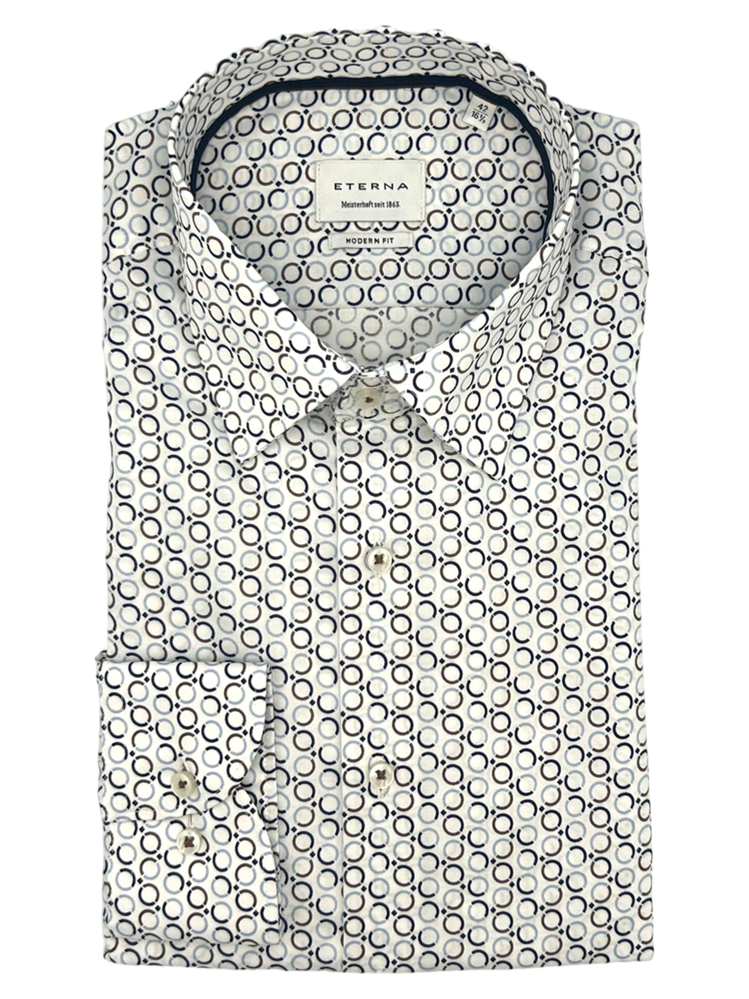 Eterna har siden de blev grundlagt i 1863 været kendt for deres gode kvalitet og ikke mindst deres ekceptionelle kvalitet. Eterna anvender bomuld og certificerede garner i deres skjorter og er derfor strygefrie. Alle Eternas skjorter er certificeret og produceret under de højeste Oeko-Tex standarder i Europa. Det betyder at samtlige skjorter er testet fri for en lang række giftige og miljøskadelige kemikalier. Eterna producerer deres skjorter i forskellige pasformer; Super Slim Fit, Slim Fit, Modern Fit og Comfort Fit - hertil fåes nogle skjorter med variende armlængde. Hos Bygholm Menswear har vi et bredt udvalg af Eterna til de allerbedste priser.