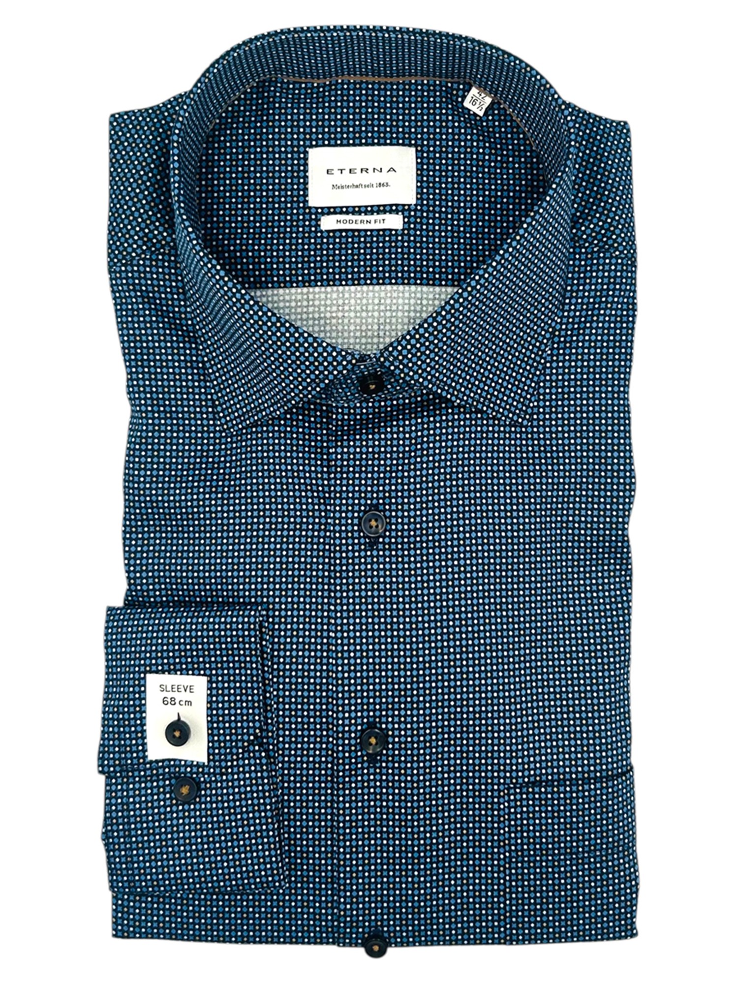 Eterna har siden de blev grundlagt i 1863 været kendt for deres gode kvalitet og ikke mindst deres ekceptionelle kvalitet. Eterna anvender bomuld og certificerede garner i deres skjorter og er derfor strygefrie. Alle Eternas skjorter er certificeret og produceret under de højeste Oeko-Tex standarder i Europa. Det betyder at samtlige skjorter er testet fri for en lang række giftige og miljøskadelige kemikalier. Eterna producerer deres skjorter i forskellige pasformer; Super Slim Fit, Slim Fit, Modern Fit og Comfort Fit - hertil fåes nogle skjorter med variende armlængde. Hos Bygholm Menswear har vi et bredt udvalg af Eterna til de allerbedste priser.