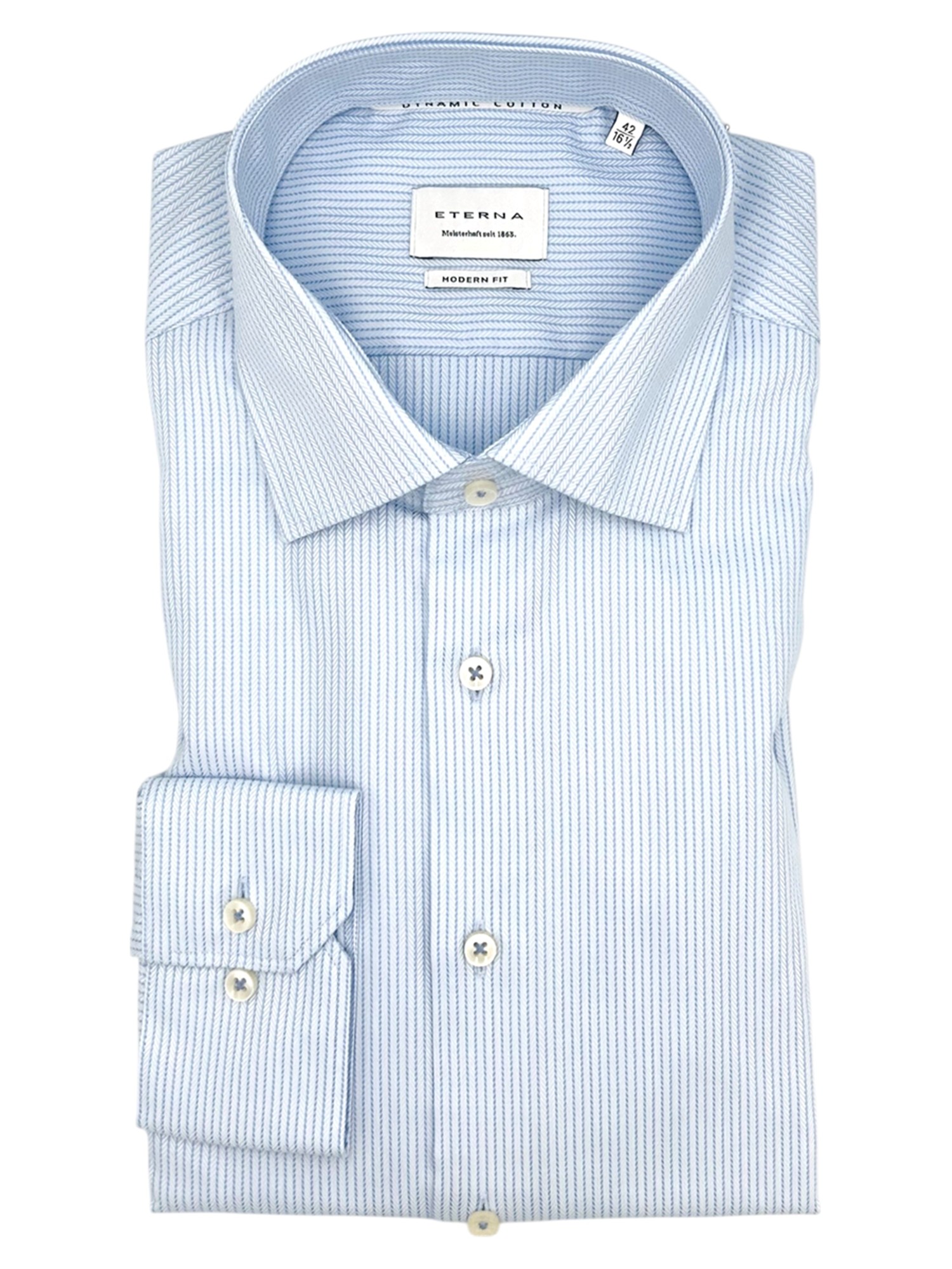 Eterna har siden de blev grundlagt i 1863 været kendt for deres gode kvalitet og ikke mindst deres ekceptionelle kvalitet. Eterna anvender bomuld og certificerede garner i deres skjorter og er derfor strygefrie. Alle Eternas skjorter er certificeret og produceret under de højeste Oeko-Tex standarder i Europa. Det betyder at samtlige skjorter er testet fri for en lang række giftige og miljøskadelige kemikalier. Eterna producerer deres skjorter i forskellige pasformer; Super Slim Fit, Slim Fit, Modern Fit og Comfort Fit - hertil fåes nogle skjorter med variende armlængde. Hos Bygholm Menswear har vi et bredt udvalg af Eterna til de allerbedste priser.