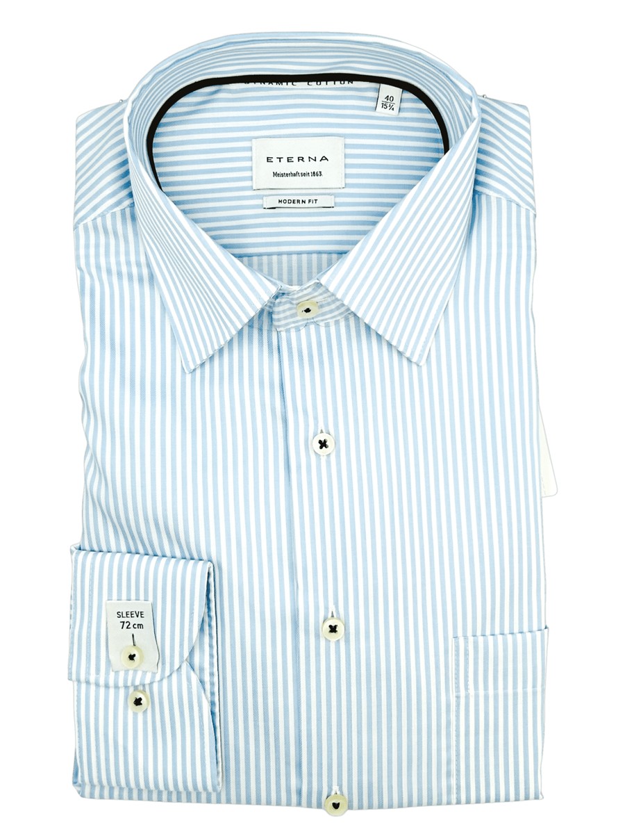 Eterna har siden de blev grundlagt i 1863 været kendt for deres gode kvalitet og ikke mindst deres ekceptionelle kvalitet. Eterna anvender bomuld og certificerede garner i deres skjorter og er derfor strygefrie. Alle Eternas skjorter er certificeret og produceret under de højeste Oeko-Tex standarder i Europa. Det betyder at samtlige skjorter er testet fri for en lang række giftige og miljøskadelige kemikalier. Eterna producerer deres skjorter i forskellige pasformer; Super Slim Fit, Slim Fit, Modern Fit og Comfort Fit - hertil fåes nogle skjorter med variende armlængde. Hos Bygholm Menswear har vi et bredt udvalg af Eterna til de allerbedste priser.