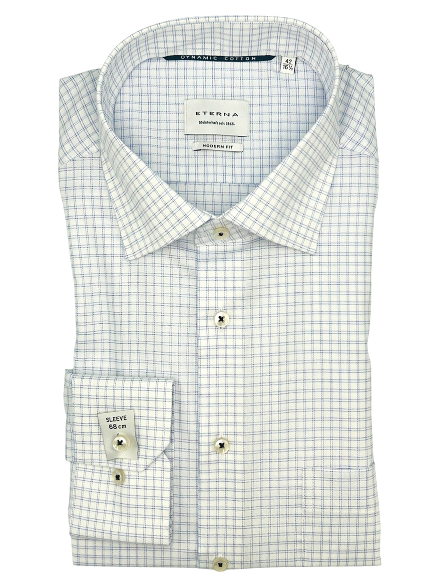 Eterna har siden de blev grundlagt i 1863 været kendt for deres gode kvalitet og ikke mindst deres ekceptionelle kvalitet. Eterna anvender bomuld og certificerede garner i deres skjorter og er derfor strygefrie. Alle Eternas skjorter er certificeret og produceret under de højeste Oeko-Tex standarder i Europa. Det betyder at samtlige skjorter er testet fri for en lang række giftige og miljøskadelige kemikalier. Eterna producerer deres skjorter i forskellige pasformer; Super Slim Fit, Slim Fit, Modern Fit og Comfort Fit - hertil fåes nogle skjorter med variende armlængde. Hos Bygholm Menswear har vi et bredt udvalg af Eterna til de allerbedste priser.