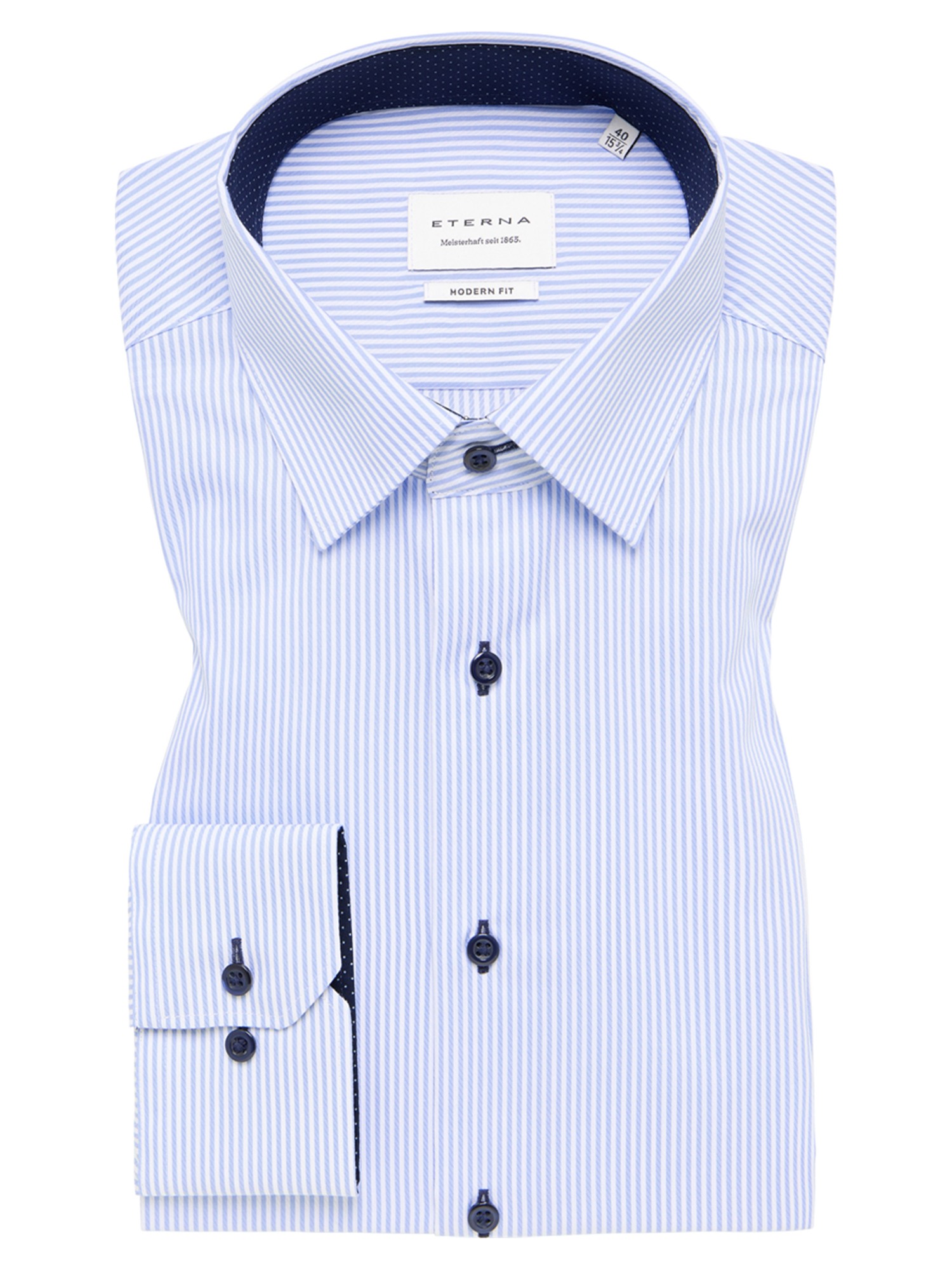 Farve: Lyse blå/hvid stribet med mørk prikket kontrastfarve invendigt i krave og manchetter
