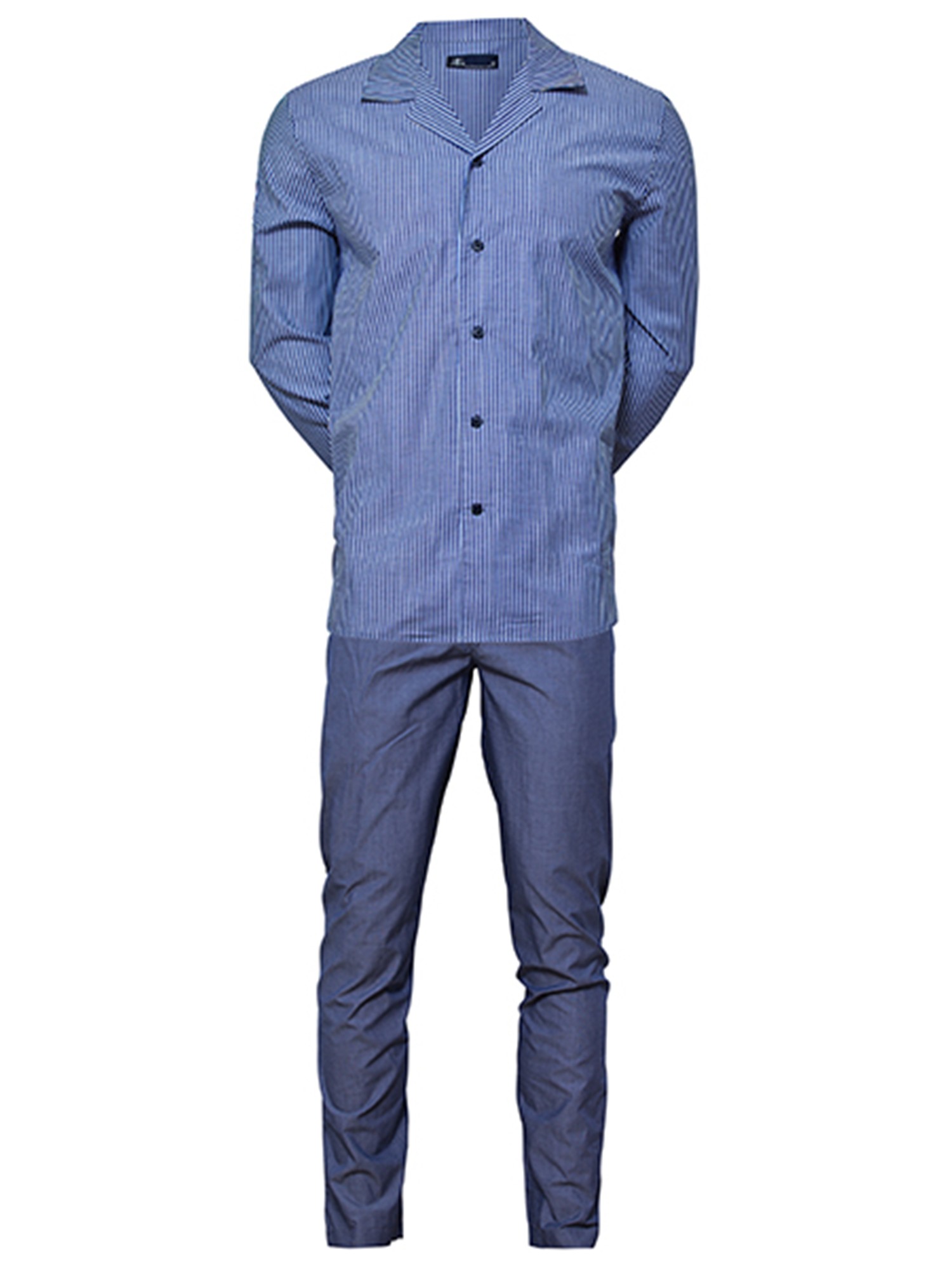 Farve: Blåtstribet skjorte med blå bukser